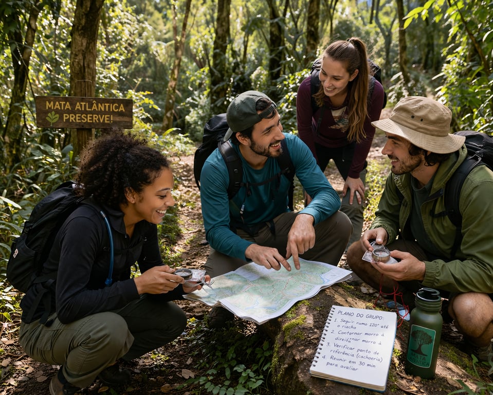 Uma atividade corporativa dinâmica e desafiadora, em que os participantes percorrem uma trilha utilizando mapa e bússola para encontrar o caminho correto.